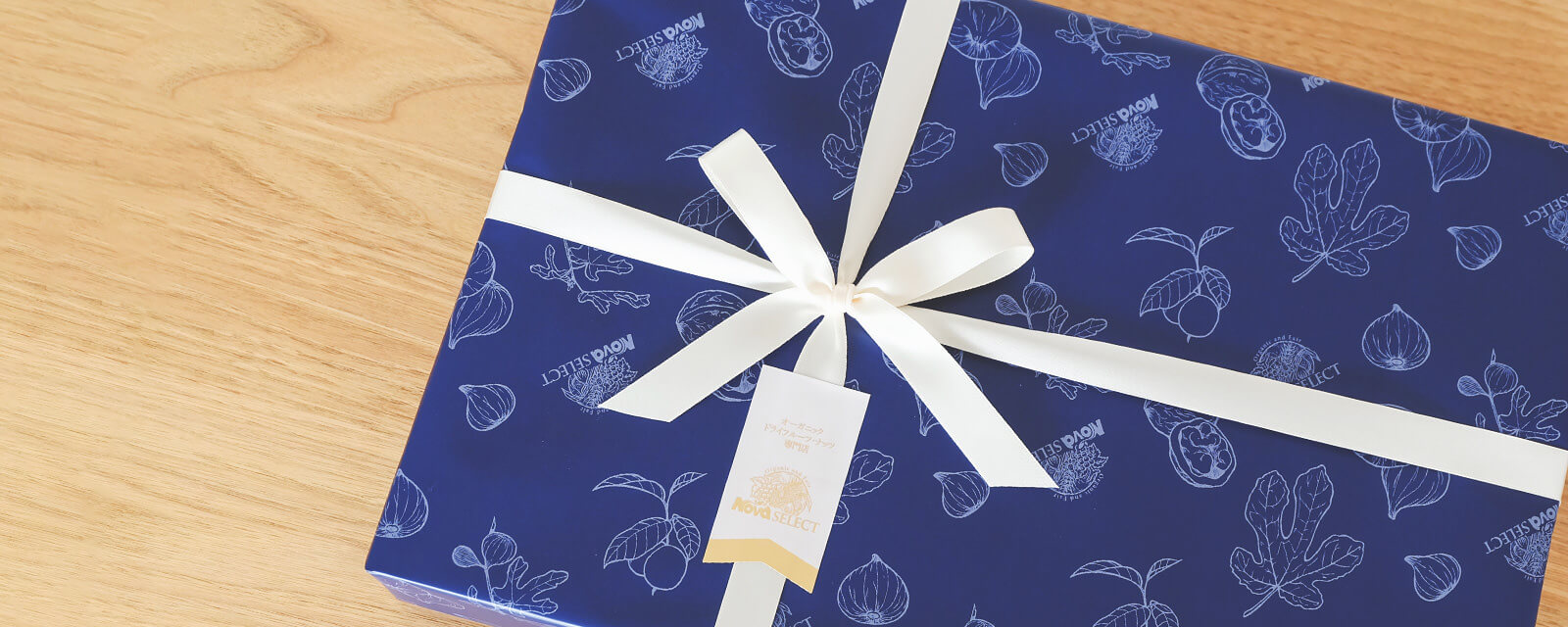 贈り物として長年ご好評いただいている「有機ドライフルーツの石畳」や、ノヴァの人気商品を詰め込んだおすすめセットなど、多彩なラインナップをご用意しました。お好みのドライフルーツやナッツ、紅茶などを組み合わせたギフトラッピングも承っています。