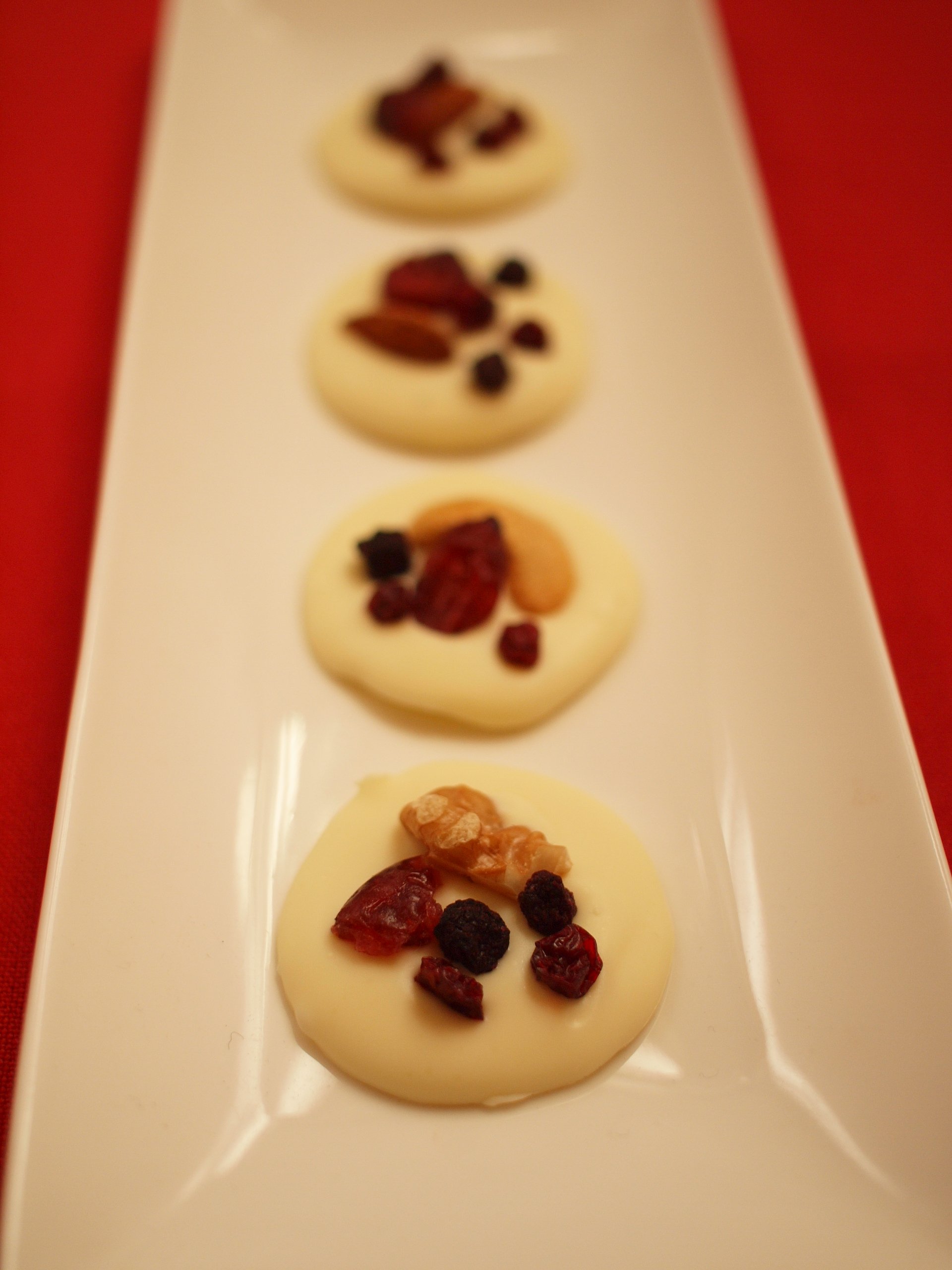 溶かしたチョコの上にナッツやドライフルーツを色とりどりにのせた、宝石のように美しいお菓子。チョコレートのテンパリングの温度さえ気をつければ、とても簡単。ホワイトチョコとベリー系のドライフルーツで清楚にまとめました。